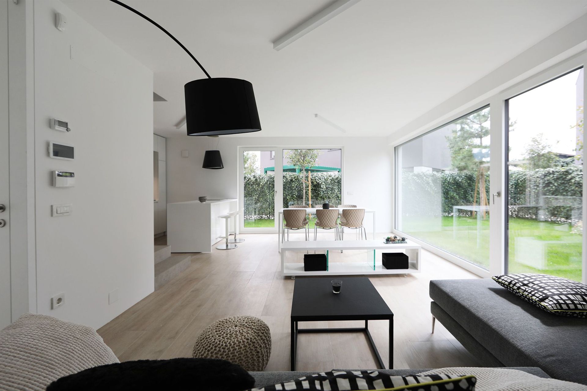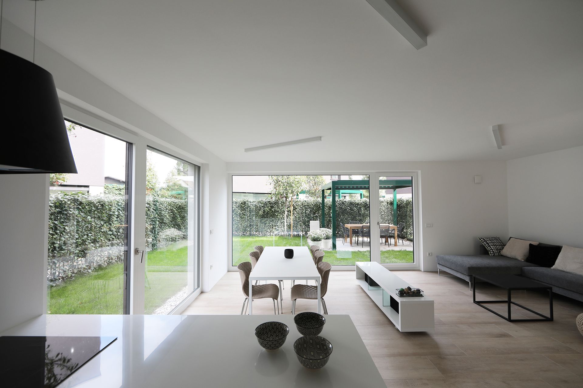 Enovit bivalni prostor v pritličju je preko velikih steklenih površin povezan z zasebnim zelenim atrijem.
