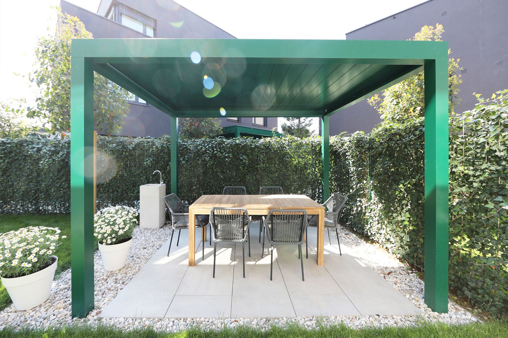 Zunanji atrij, deluje kot zunanja zelena dnevna soba, paviljon sredi bujnega rastja nudi primerno zaščito v vseh vremenskih pogojih.