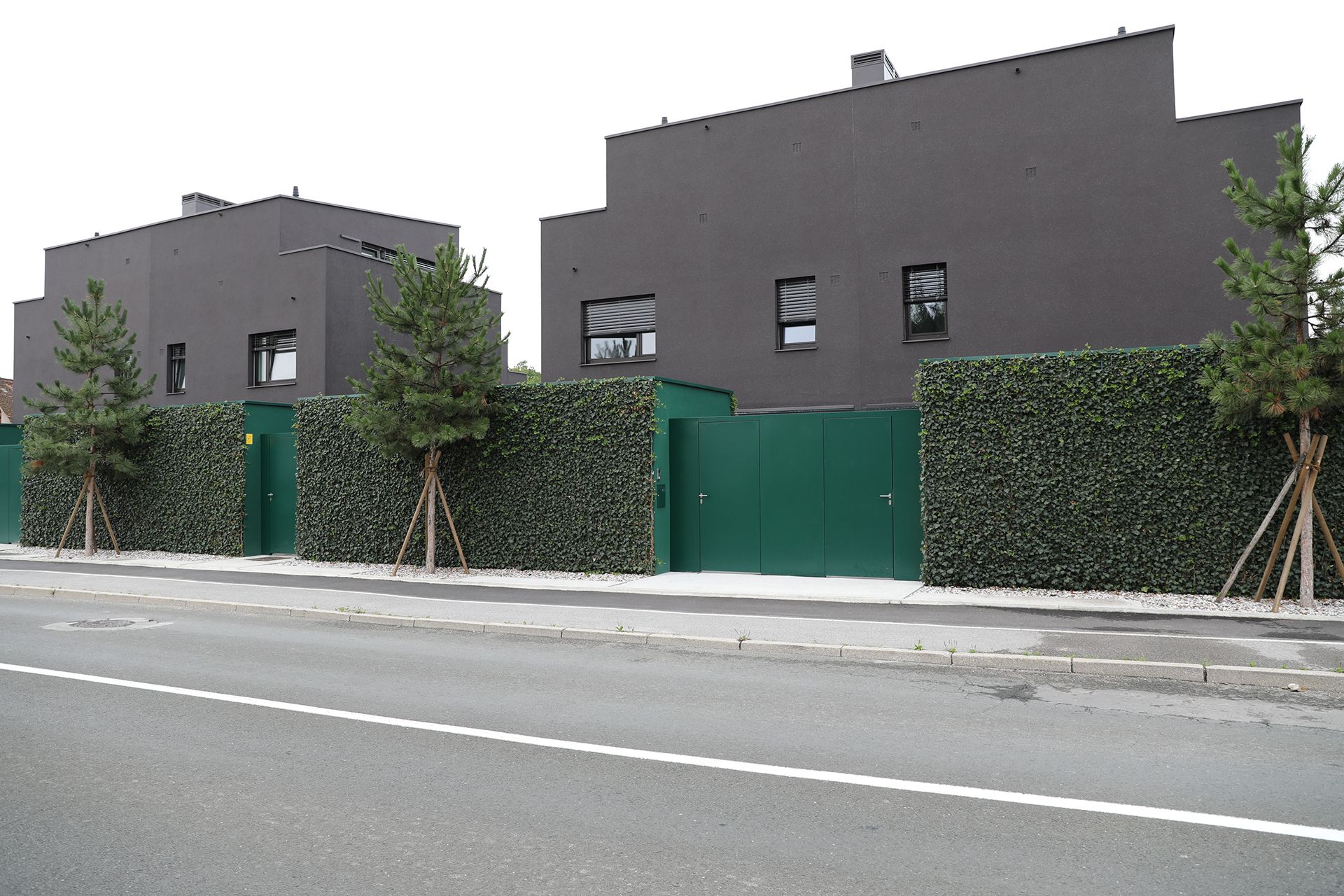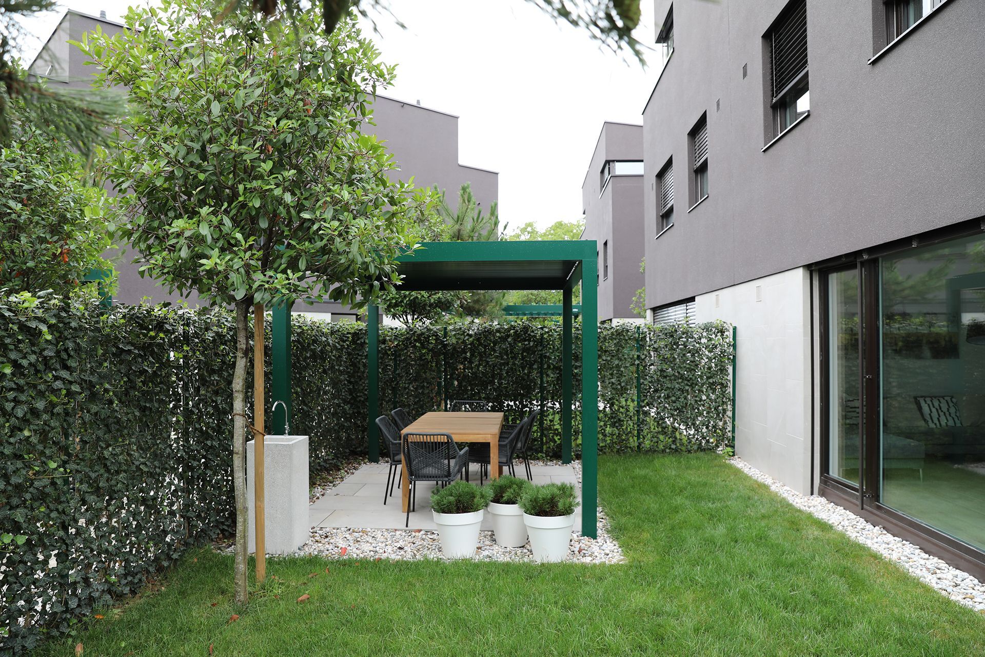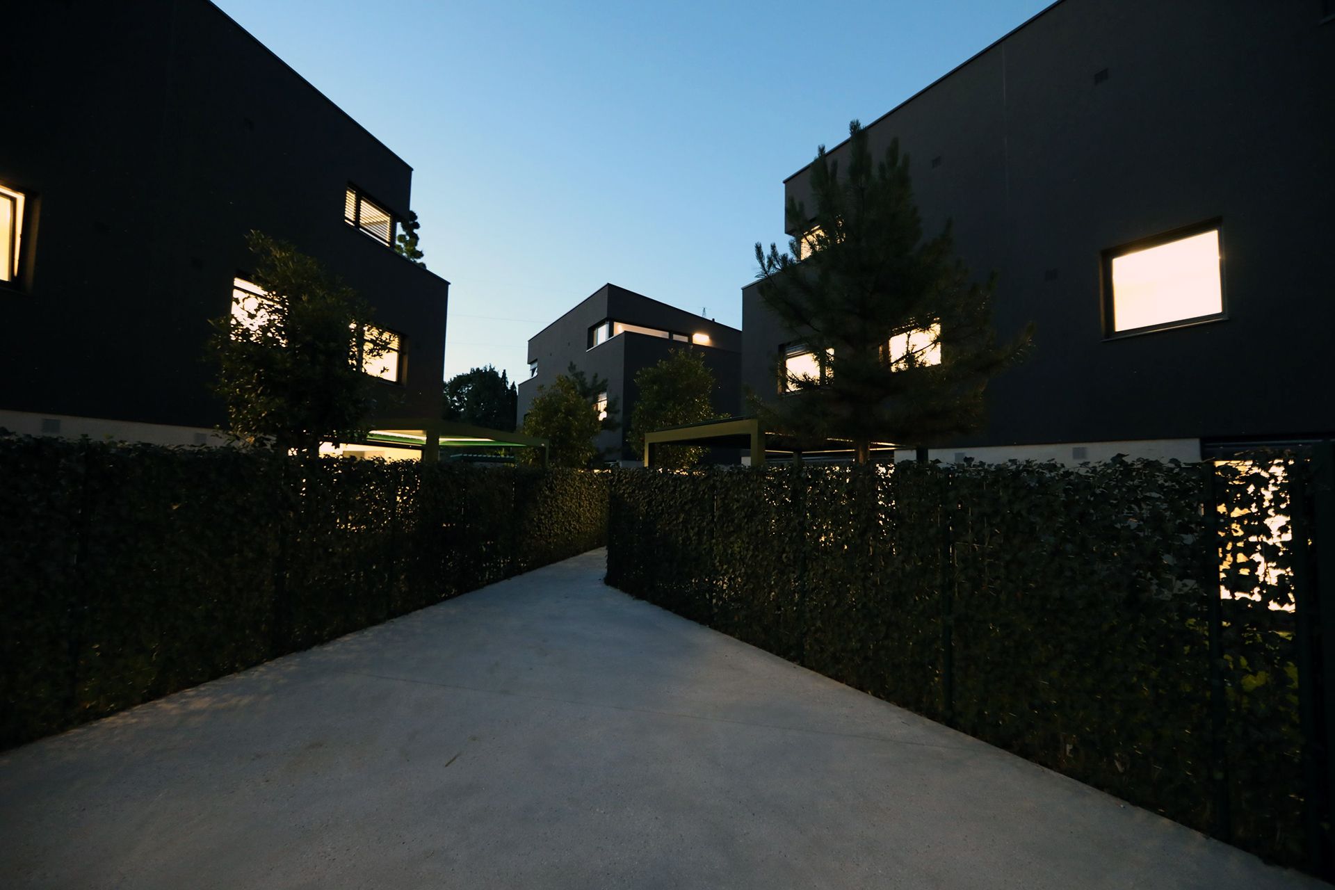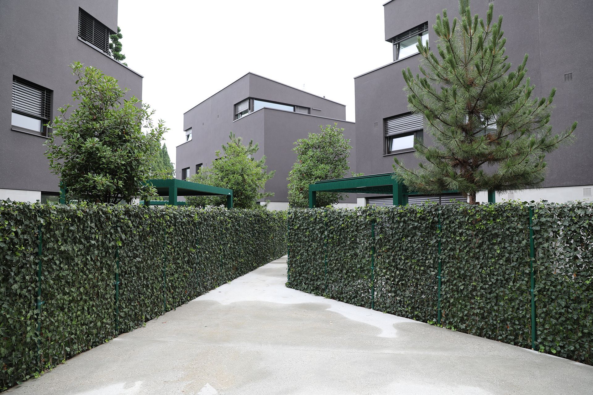 Zimzeleno rastje po celotnem parterju v sožitju z zemeljsko barvo objektov nudi pomirjajoče naravno okolje.