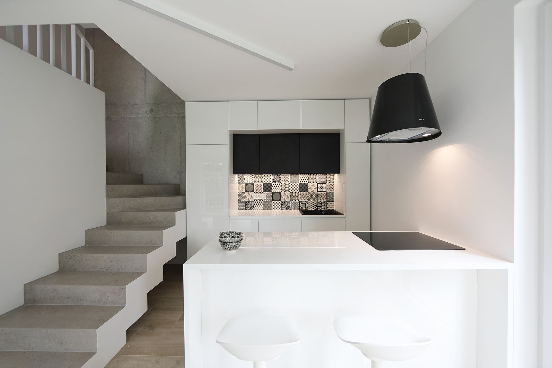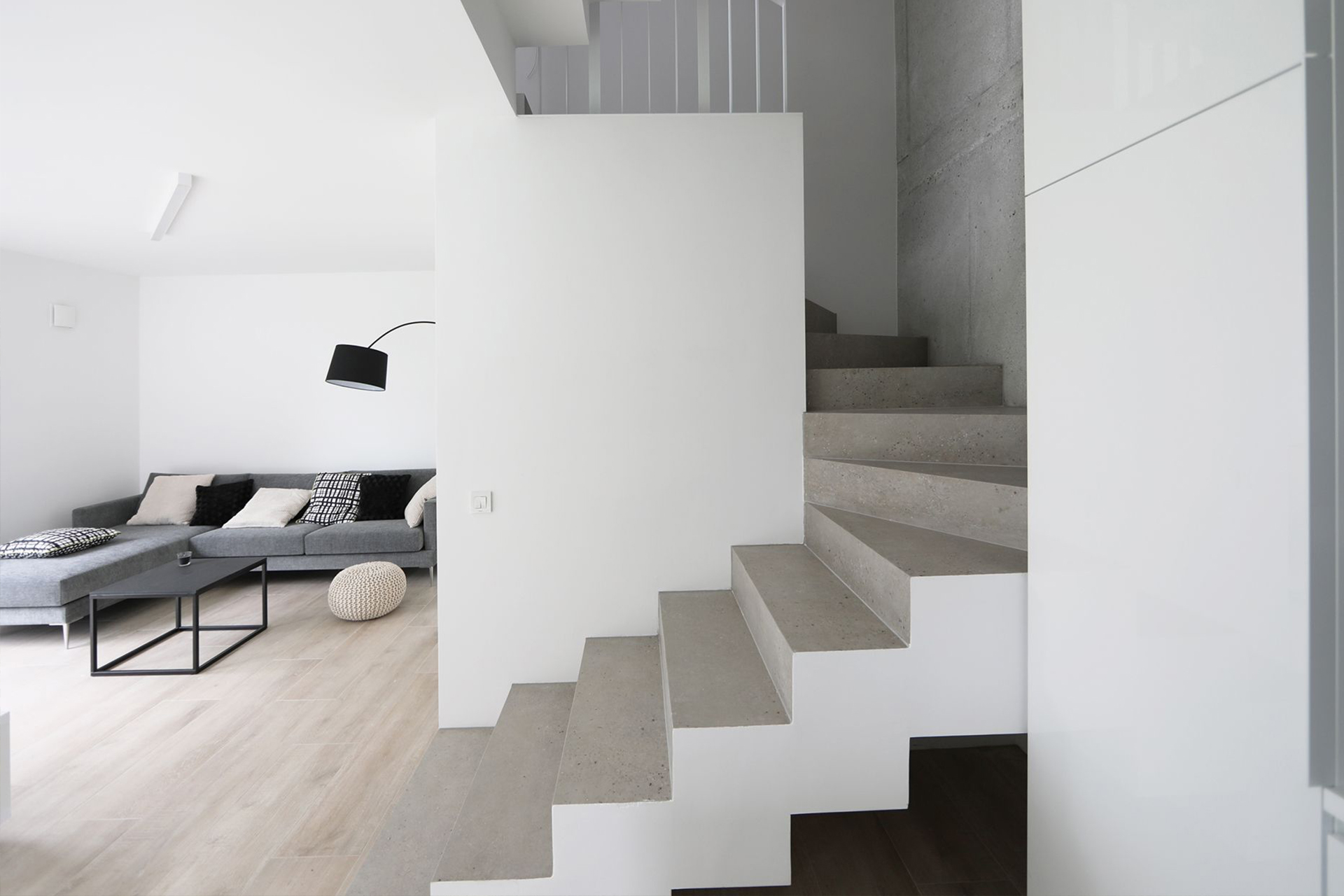 Odprto stopnišče povezuje vse prostore in deluje kot skulptura v prostoru.