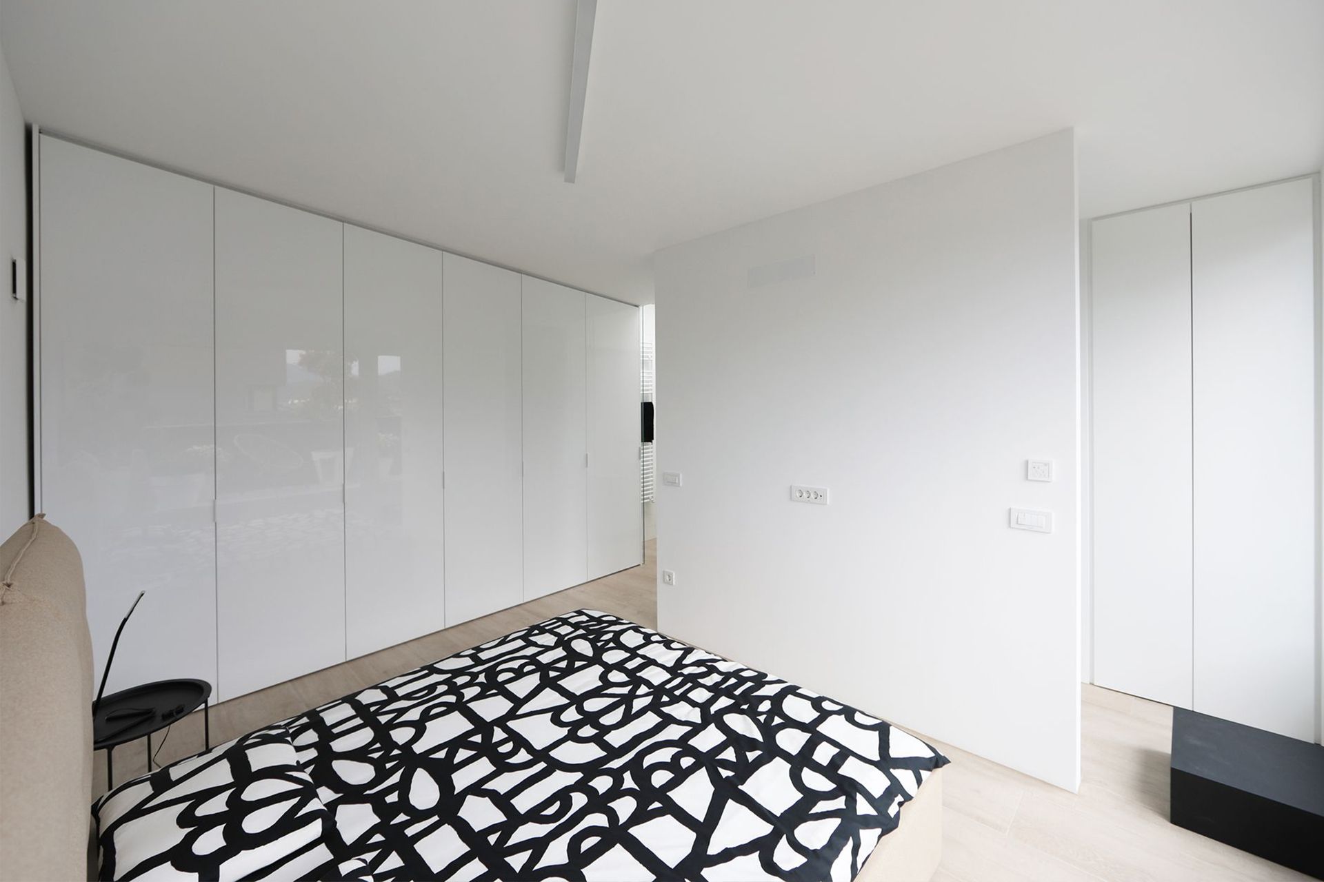 Vgradne omare čistih linij s prehodom do zasebne kopalnice, da boste vedno lahko uživali v pospravljenem ambientu.