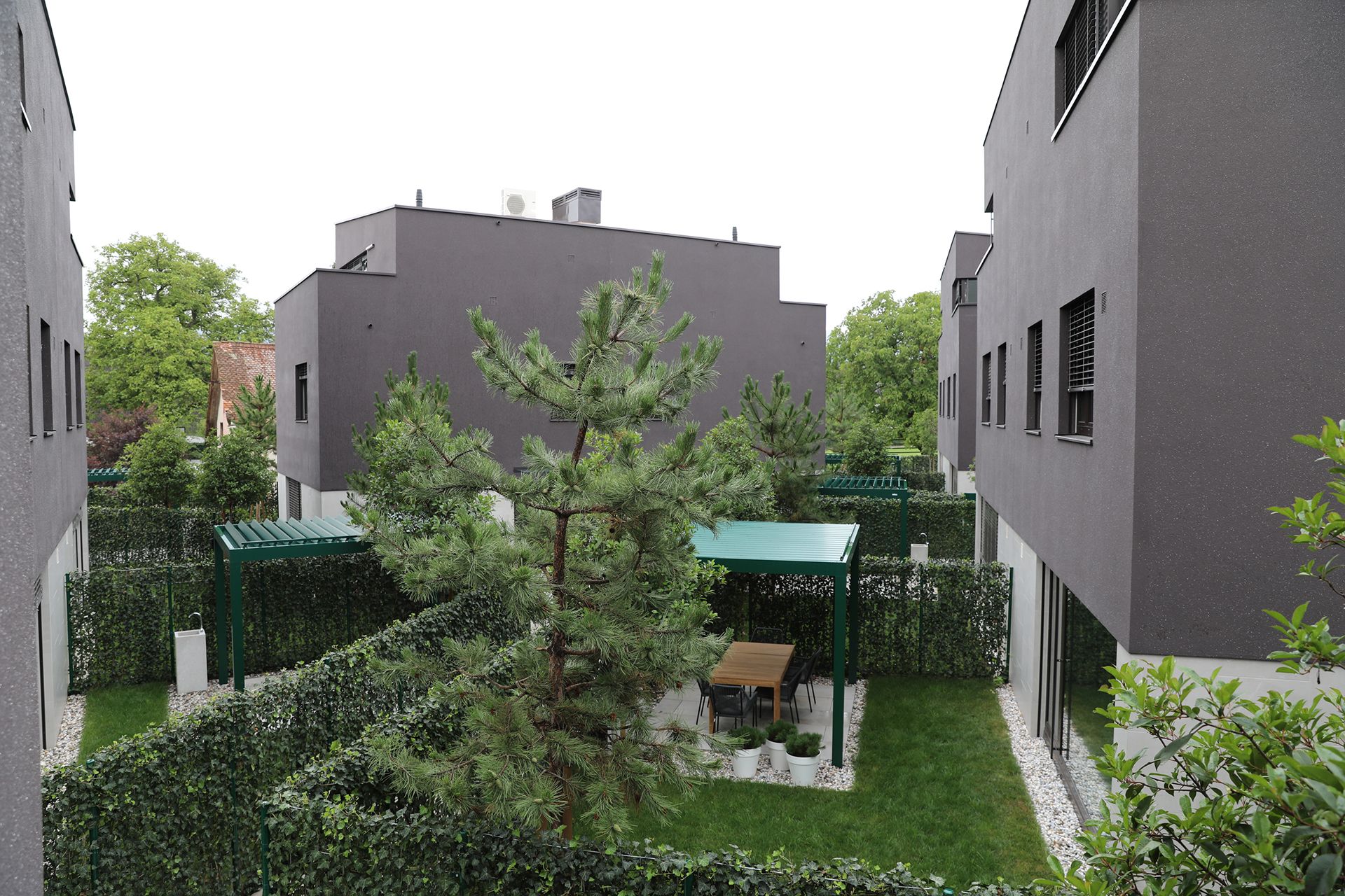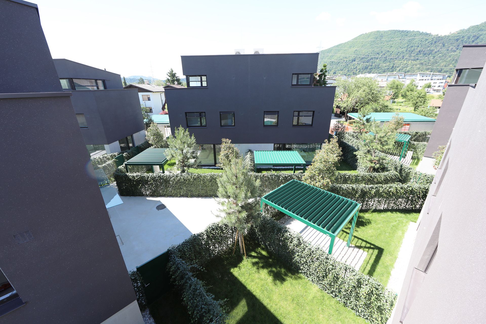 Lastniški atriji ob Vilah na Brodu so zazelenjeni s travo, bršljani, fotinijami in borovci ter skupaj tvorijo zimzeleni park.