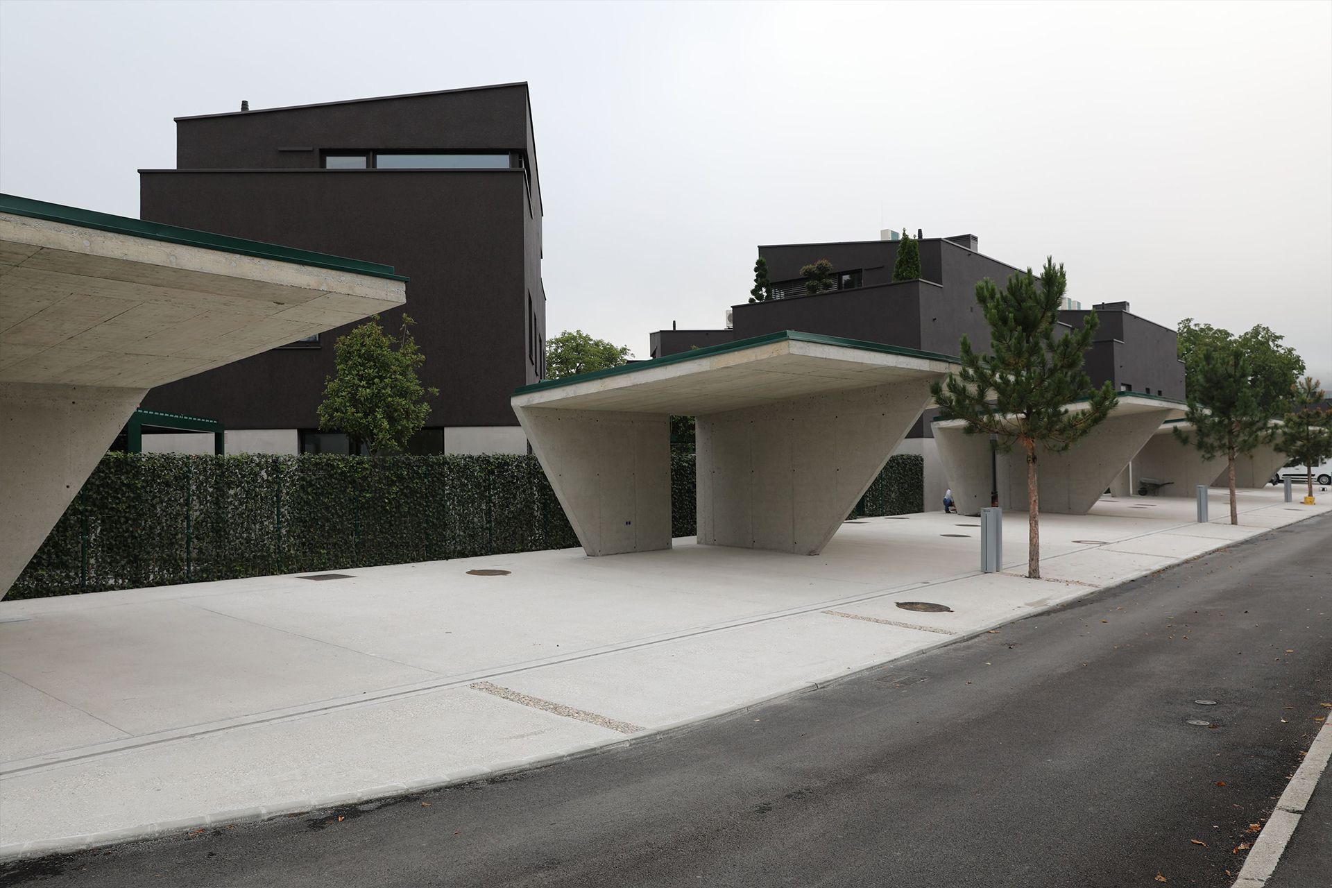Parkrišča ob robu naselja so ločena od zasebnih vrtov, primerno varovana in opremljena z elektriko za morebitno polnjenje električnih avtomobilov.