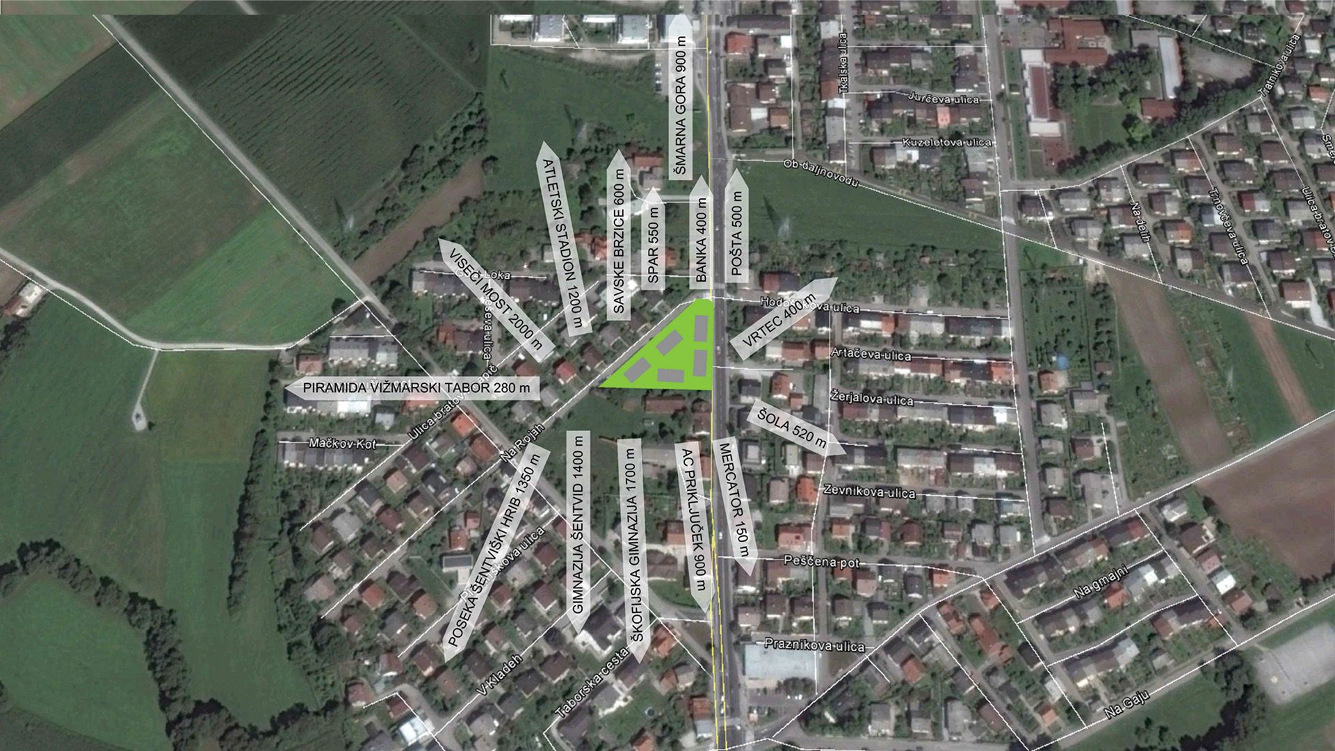Vile na Brodu se nahajajo v Ljubljani, na Brodu pod Šmarno goro, med ulicama: Tacenska cesta, in cesta Na Rojah. V neposredni okolici je vsa potrebna infrastruktura: šole, vrtec, trgovine, banka, pošta, restavracije, veliko rekreacijskih površin in javni prevoz. Šole in vrtec: Osnovna šola Vižmarje Brod, vrtec enota Mravljinček, Gimnazija Šentvid, Škofijska gimnazija. Trgovine: Mercator, Spar, ... LPP: 8, 15. Restavracije: Kaval, Dvor, ... Rekreacijske površine: številne poti in ceste za kolesarjenje in sprehode, Šmarna gora, tenis, golf v Smledniku, kajak, kanu Tacen.